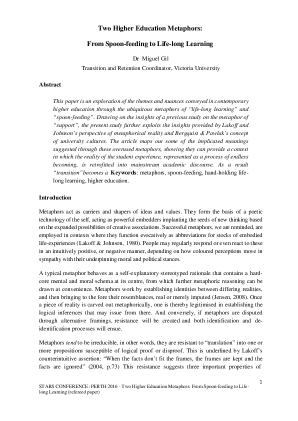 Pdf Two Higher Education Metaphors From Spoon Feeding To Life Long Learning Miguel Gil Academia Edu