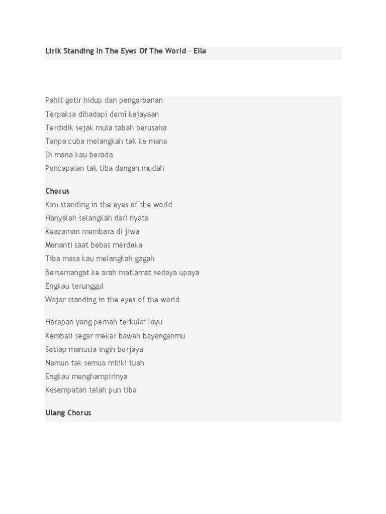 Details of Ella-Standing In The Eyes of The World Lyrics MP3 check it out. Dan pengorbanan E Asus2 Terpaksa dihadapi demi kejayaan Fm B Terdidik sejak mula tabah berusaha E Gm Cm C Tanpa. Dan pengorbanan Terpaksa dihadapi demi kejayaan Terdidik sejak mula tabah berusaha Tanpa cuba melangkah tak kemana Di mana kau berada Pencapaian tak tiba dengan mudah.